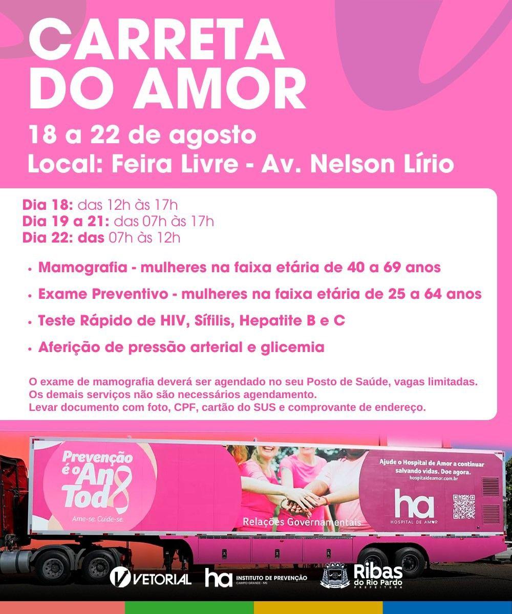 Começa hoje, 18 de agosto, o atendimento da Carreta do Amor em Ribas do Rio Pardo. Até o dia 22 de agosto, a população poderá contar com diversos exames gratuitos na Feira Livre, localizada na Avenida Nelson Lírio.
