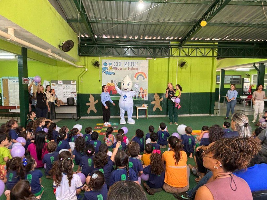 A programação no CEI Zedu incluiu atividade lúdica com balões, brincadeiras e a participação do personagem Zé Gotinha, além de uma conversa interativa com crianças e educadores sobre a importância da vacinação e a identificação de casos suspeitos de sarampo.
