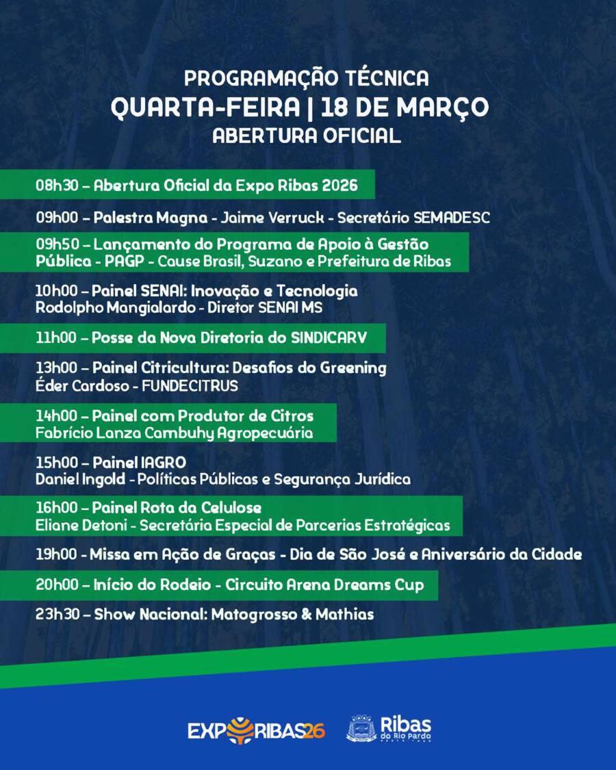 A expectativa é de que a feira reúna lideranças, produtores rurais, empresários, estudantes e representantes do poder público, consolidando Ribas do Rio Pardo como um dos polos emergentes de desenvolvimento do Estado.