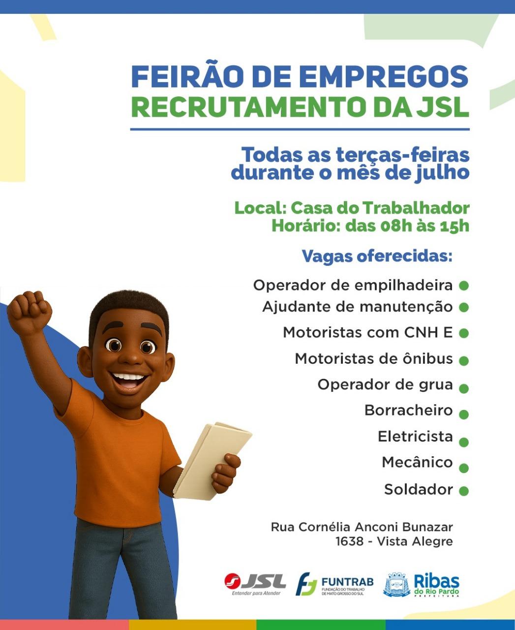 A empresa JSL, uma das parceiras do município, estará presente em todas as terças do mês com diversas oportunidades de trabalho imediatas. As vagas atualizadas incluem: