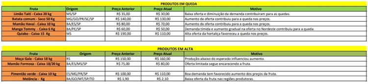 Entre as hortaliças, o maior destaque é o quiabo, que chegou a custar R$ 190,00, mas agora está sendo vendido por R$ 110 a caixa com 15 kg. A batata, por sua vez, está sendo comercializada a R$ 130 o saco com 50 kg – cerca de 7% mais barato que na semana anterior.