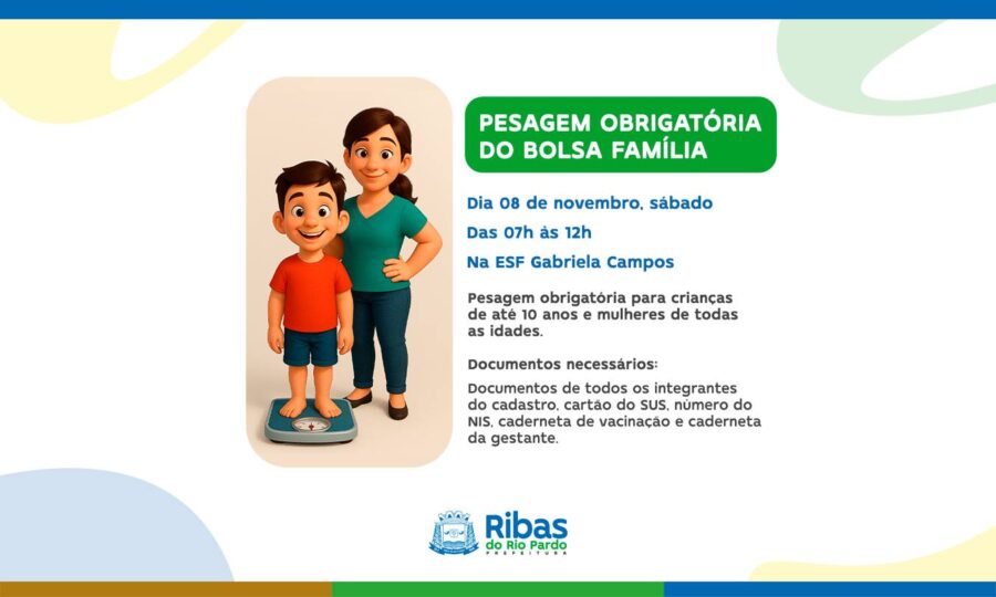 A Prefeitura de Ribas do Rio Pardo, por meio da Secretaria Municipal de Saúde, realiza neste sábado, 8 de novembro, a pesagem obrigatória do Programa Bolsa Família, na ESF Gabriela Campos, das 7h às 12h.